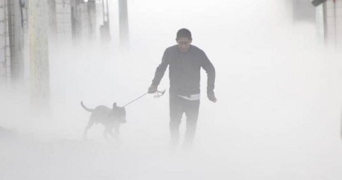 En un video tomado por el reportero Alejandro Hernández Limón se ve al hombre desaparecer en la nube y después salir corriendo con su perro a un lado.