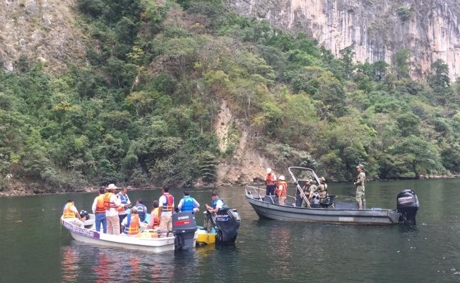 Expertos en geología realizaron un recorrido en la zona del derrumbe en el interior de cañón del sumidero, para determinar el nivel de daño ocasionado por el deslave y determinar abrir la navegacion sobre el río Grijalva.