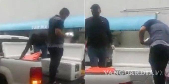 En el video de 1 minuto 20 segundos, se puede observar como al menos cuatro hombres que usaban guantes de protección, a bordo de una camioneta blanca, sacan jugos y alimentos envueltos en aluminio y plástico de dos hieleras, y los entregan a las personas que se acercan a recibirlos.