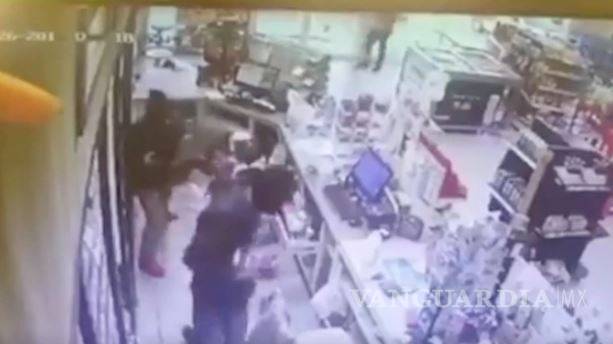 Un empleado de 15 años fue asesinado durante un asalto a una tienda de conveniencia en Manzanillo, Colima. Mientras el joven está hincado y de espaldas, uno de los delincuentes le apunta y lo mata.