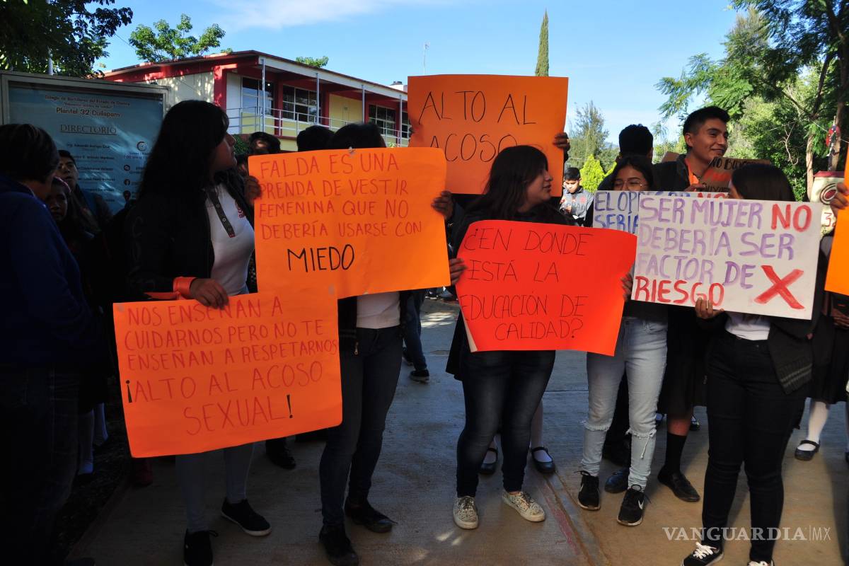 Con cartulinas que tenían escritas consignas como “Ser mujer no debería ser factor de riesgo”, “Falda es una prenda de vestir femenina que no debería usarse con miedo”, y “¿En dónde está la educación de calidad?”, los estudiantes exigieron a las autoridades escolares investigar y sancionar los hechos.