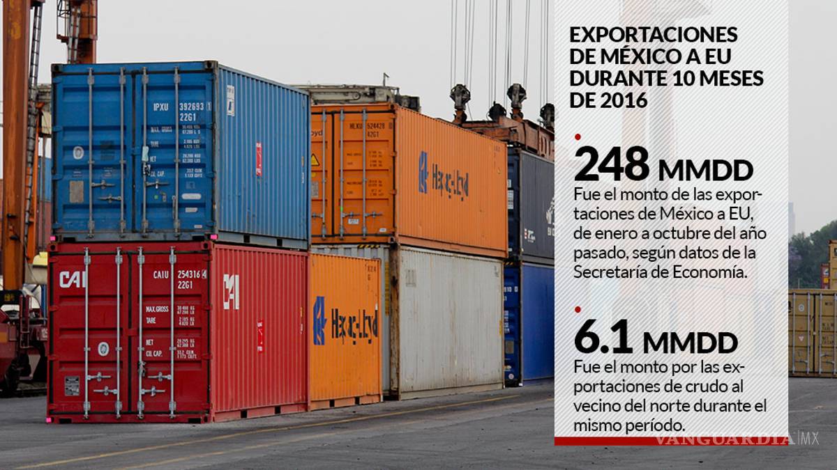 De enero a octubre del año pasado, México exportó 248 mil 077 millones 139 dólares a Estados Unidos. Uno de los bienes comercializados fue el petróleo, sobre todo el crudo, con 6 mil 110 millones 537 dólares, de acuerdo con datos de la Subsecretaría de Comercio Exterior de la Secretaría de Economía (SE).