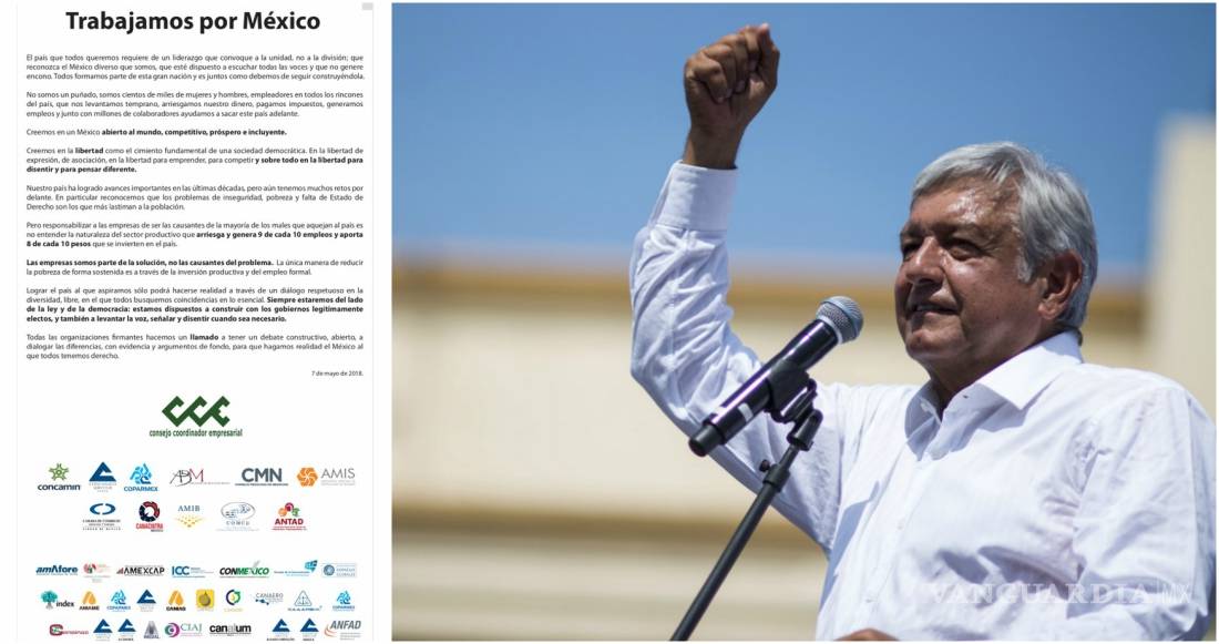 Como lo adelantó ayer el candidato de la coalición “Juntos Haremos Historia”, Andrés Manuel López Obrador, este lunes se publica un nuevo desplegado en la prensa nacional firmado por 400 organizaciones de la iniciativa privada en el que afirman que las empresas no son las causantes de los males que aquejan a México, sino son parte del desarrollo.