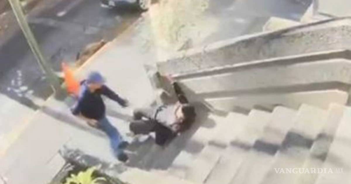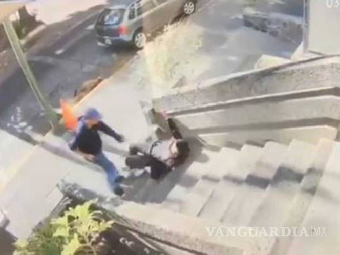 Ya en el piso, el ladrón logra quitarse sus pertenencias para después darse a la fuga.