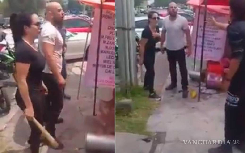 Mientras que la mujer lo amenaza con un bat, el hombre patea y golpea a un vendedor de nieves en Satélite por "invadir" el espacio de su bar en la vía pública