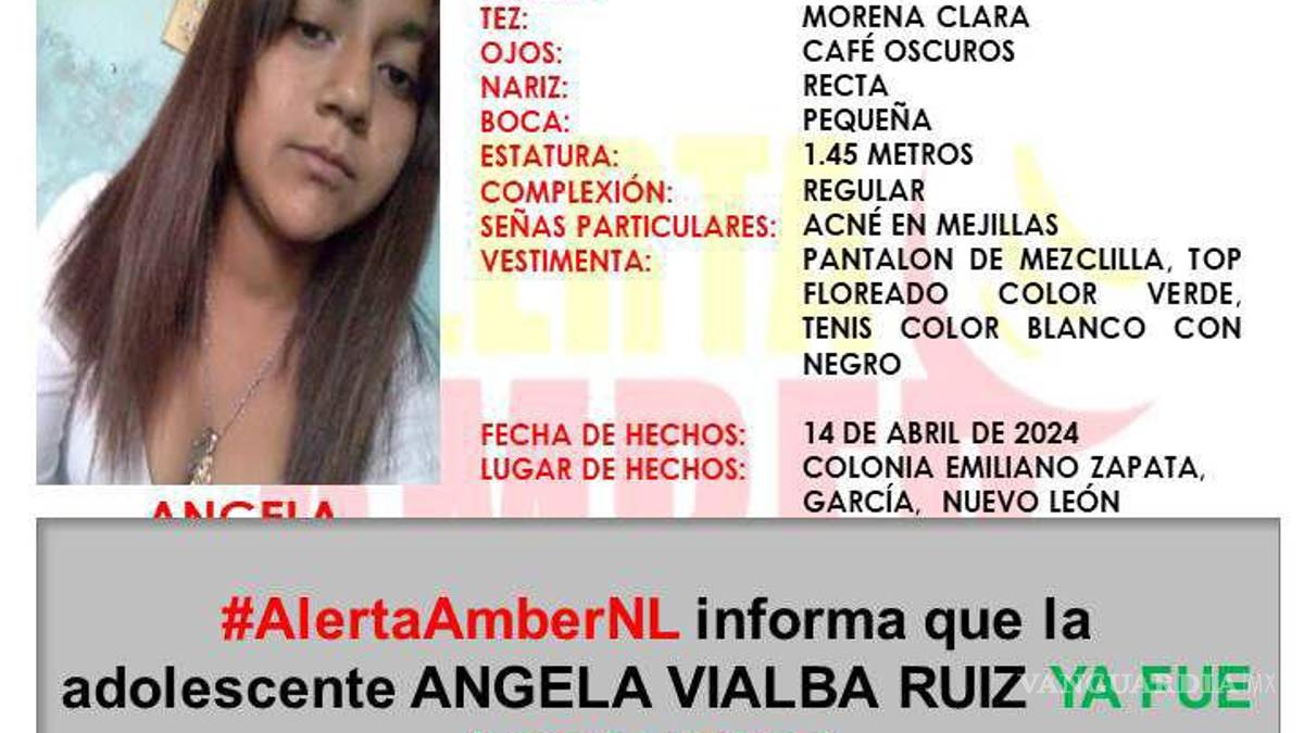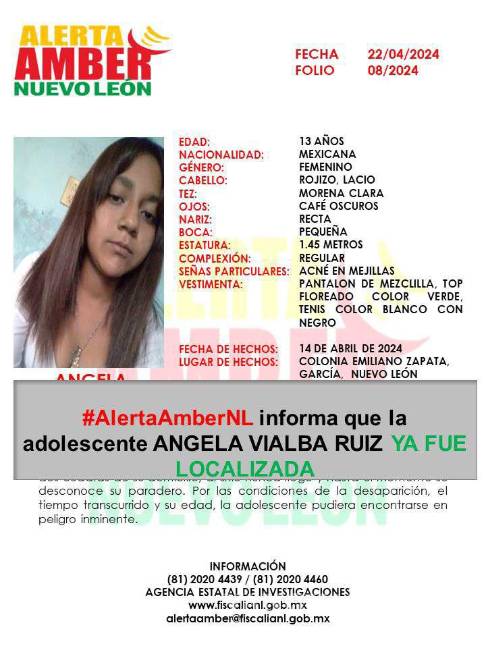 Angela Vialba Ruiz había sido vista por última ocasión en la colonia Emiliano Zapata, en García, Nuevo León; sin embargo, fue encontrada en el ayuntamiento de Monterrey, en buenas condiciones de salud.