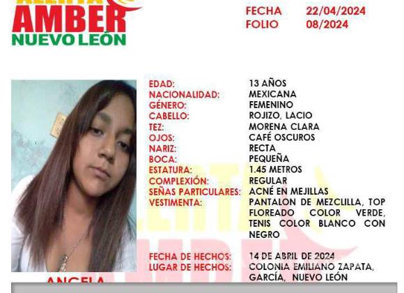 Monterrey, Nuevo León.- La Fiscalía General de Justicia de Nuevo León (FGENL) informó que ya fue localizada una menor de 13 años de edad, quien se encontraba desaparecida desde el pasado 14 de abril.