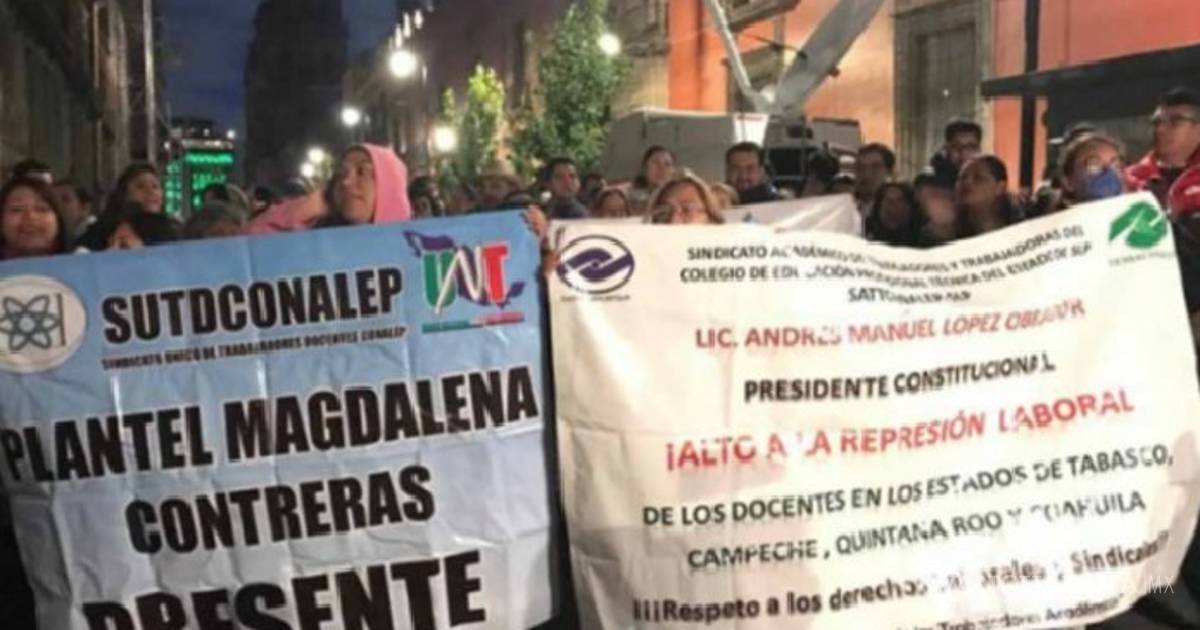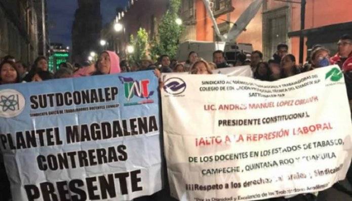 Maestros de telebachillerato y del Conalep exigen pagos, protestan en Palacio Nacional