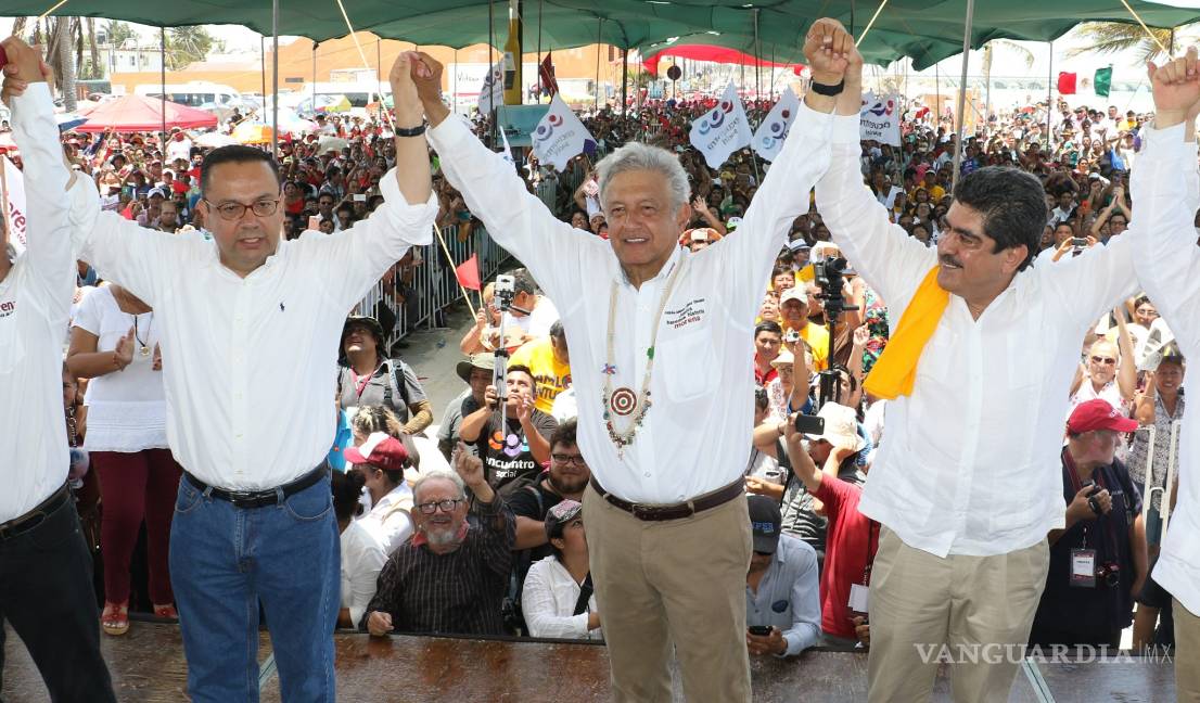 De manera inédita, López Obrador fue flanqueado en un mitin en este puerto por los ex presidentes nacionales del albiazul, Manuel Espino y Germán Martínez, quienes lanzaron un llamado a militantes panistas para que se unan a la campaña del candidato de la alianza Juntos Haremos Historia.