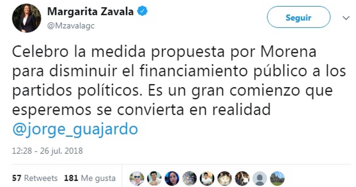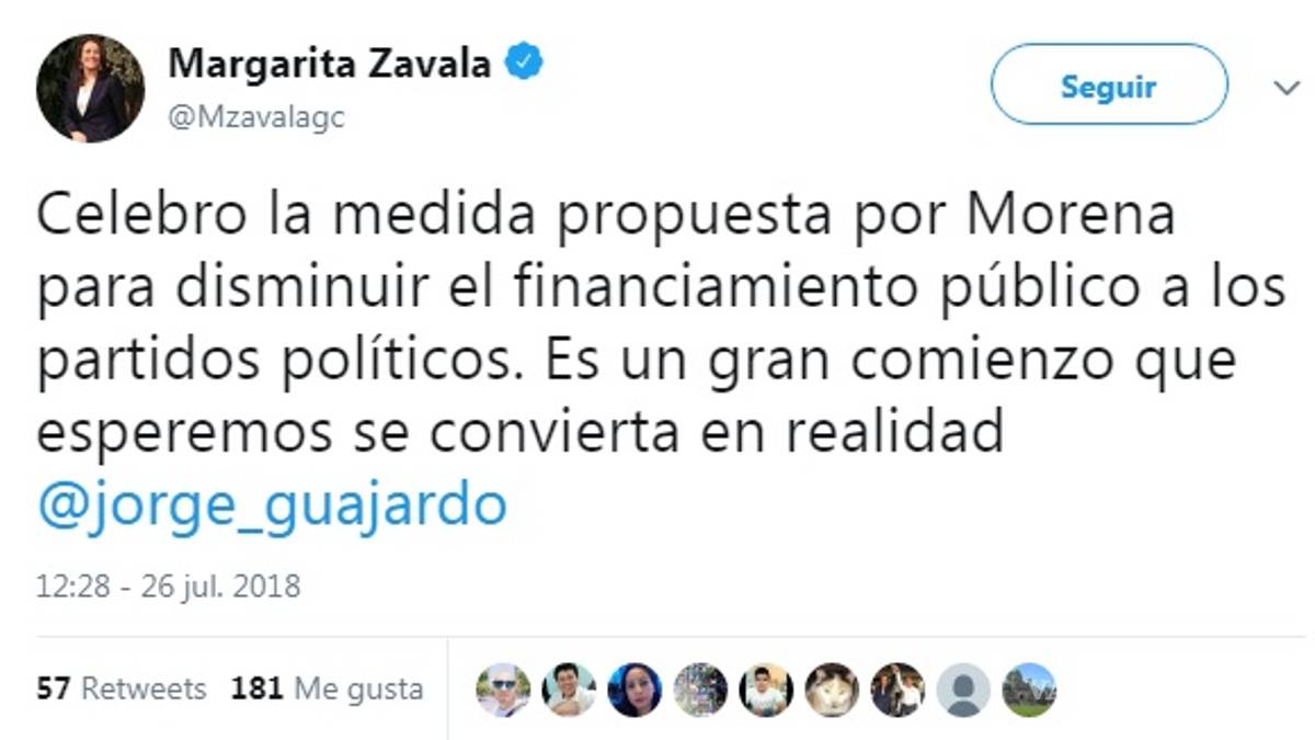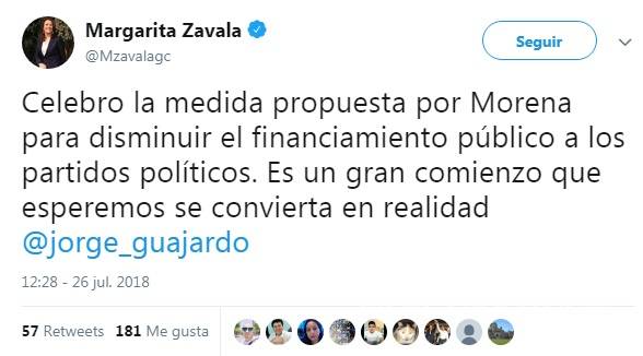 En su cuenta de Twitter escribió “Celebro la medida propuesta por Morena para disminuir el financiamiento público a los partidos políticos. Es un gran comienzo que esperemos se convierta en realidad”.