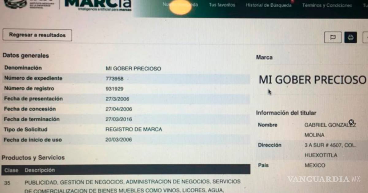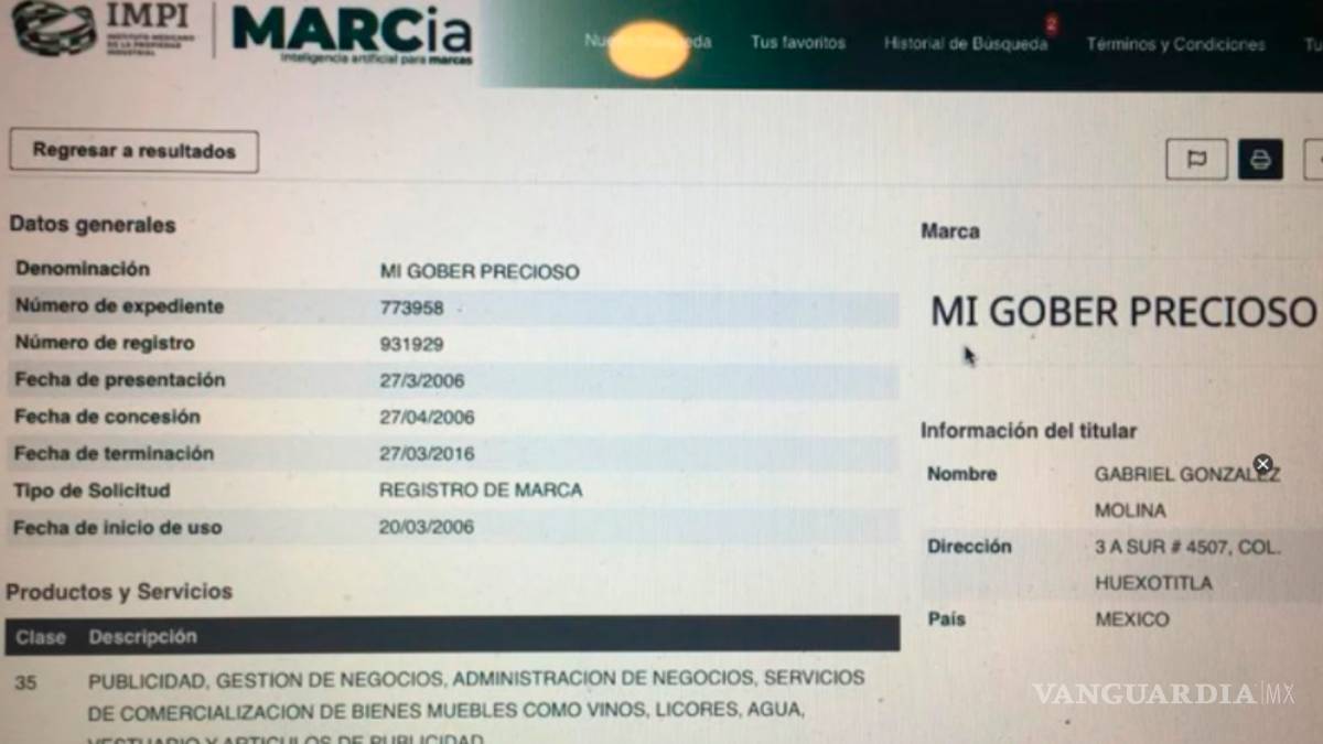 El IMPI indicó que el alias del Góber Precioso infringiría el artículo 90 fracciones XII, y XIV de la Ley de la Propiedad industrial, en relación con los artículos 87, 88 y 89, le negó el registro en su primera solicitud, sin embargo, González Molina entregó un documento en el que Marín Torres avaló el uso de su sobrenombre, con lo que el 27 abril el Instituto entregó los derechos de la marca por un periodo de 10 años, es decir, hasta el 27 de marzo de 2016.