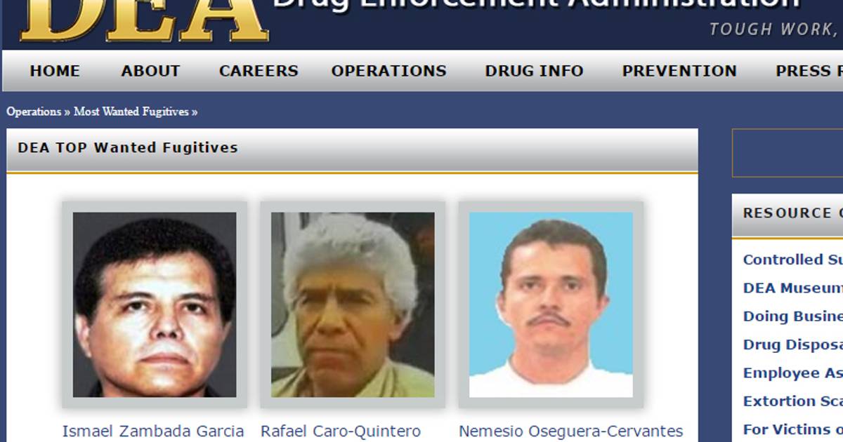 Acusados de traficar drogas, perpetrar asesinatos violentos, realizar fraudes y otros delitos, los mexicanos prófugos de la justicia aparecen en la portada del sitio de internet de la DEA son Ismael “El Mayo” Zambada García, Rafael Caro Quintero y Nemesio Oseguera Cervantes.
