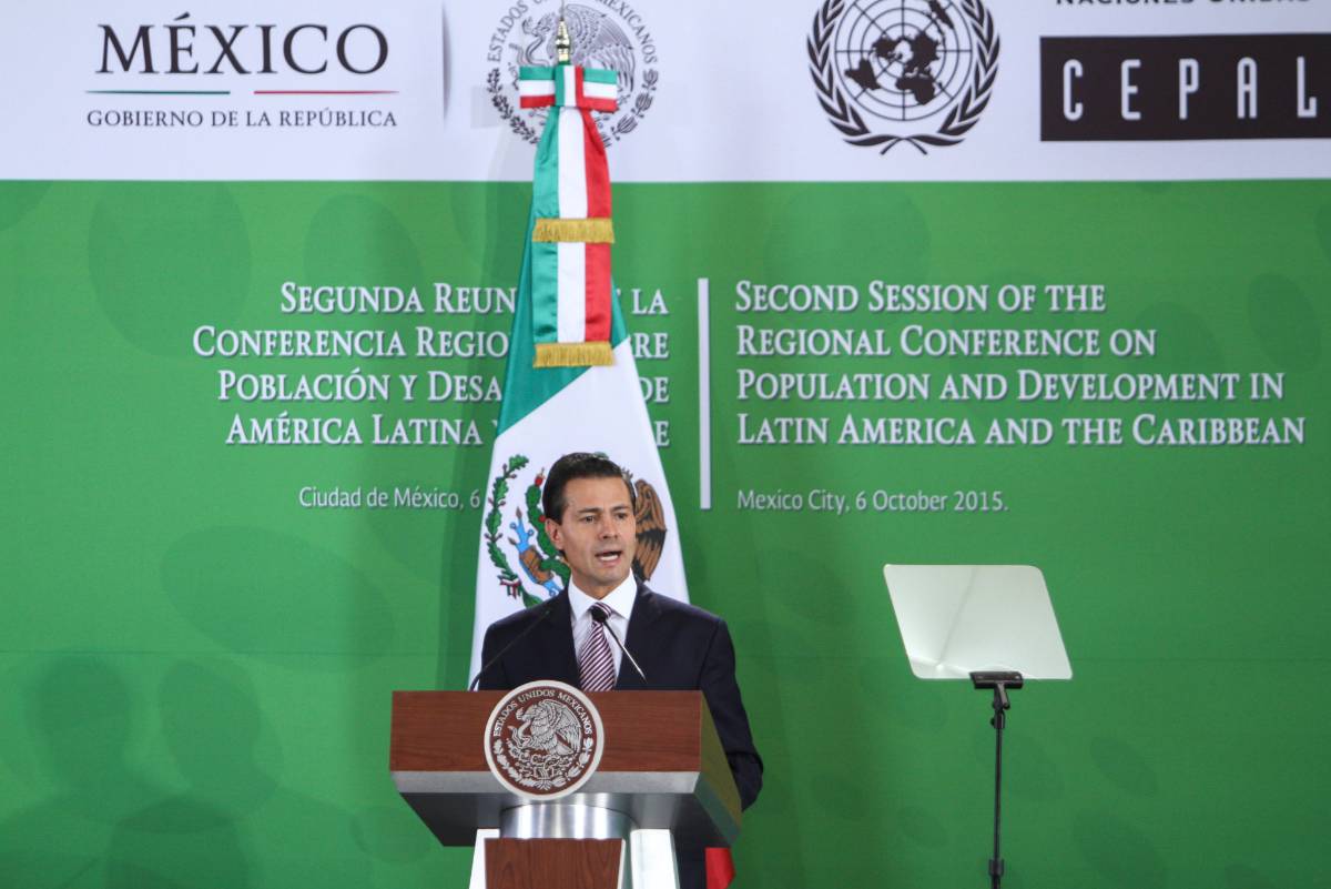 Acompañado de cinco secretarios de Estado y la secretaria ejecutiva de la CEPAL, Alicia Bárcena Ibarra, el Presidente Peña Nieto detalló las acciones que se implementan como parte del Programa Nacional de Población 2014-2018 para atender la transición demográfica que enfrentará nuestro país en las próximas cuatro décadas, como es el crecimiento en la población mayor y la reducción en el número de jóvenes.