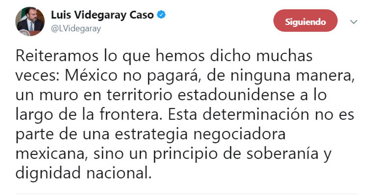 Ciudad de México. El gobierno de México insistió este jueves en que no pagará por un muro en la frontera con Estados Unidos y aseguró que no negociará el Tratado de Libre Comercio de América del Norte (TLCAN) ni otros temas bilaterales a través de redes sociales, en respuesta a tuits del presidente estadunidense, Donald Trump.