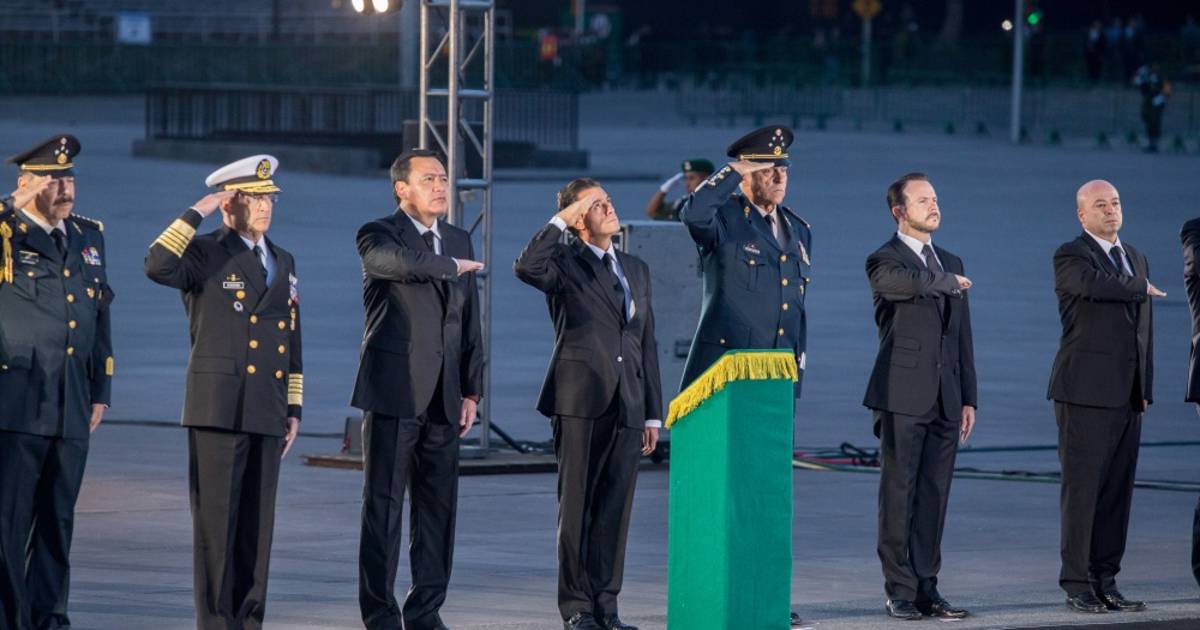 Peña Nieto estuvo acompañado en la ceremonia, entre otros, por el ministro del Interior (secretarios de Gobernación), Miguel Ángel Osorio Chong, y los responsables del Ejército y la Marina Armada. Una banda de guerra hizo un toque para guardar silencio y se cantó el himno nacional.