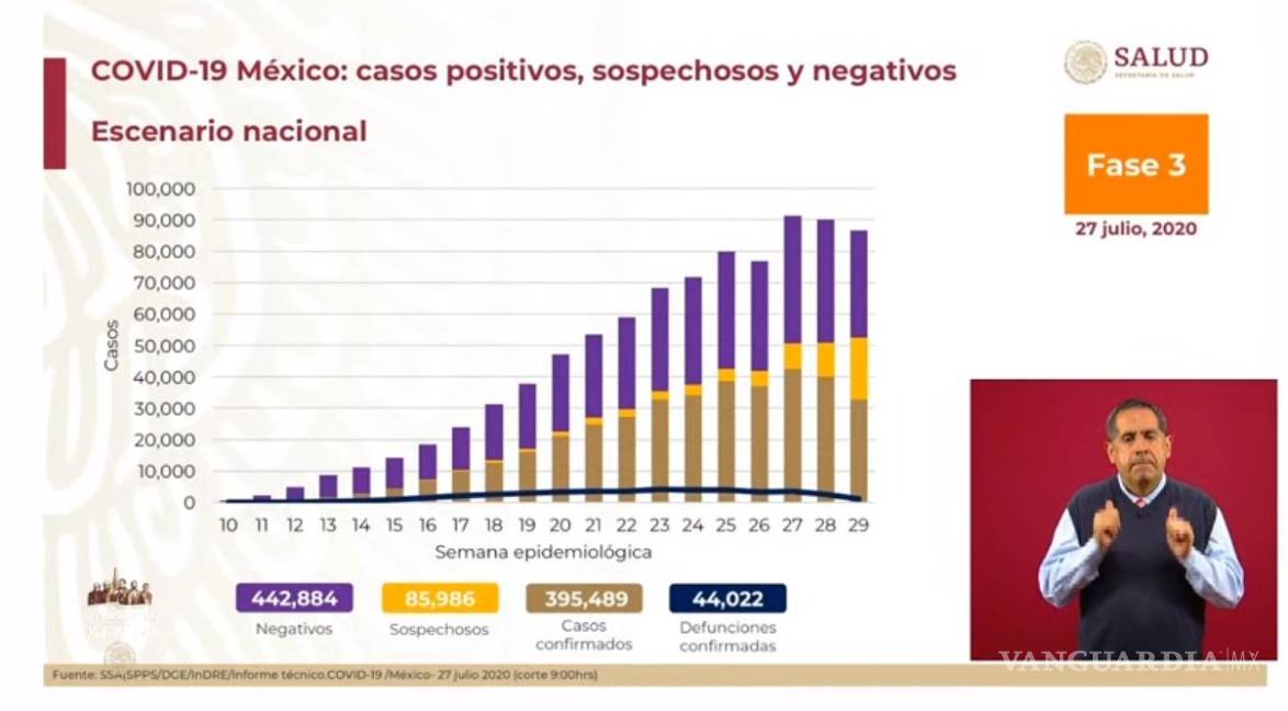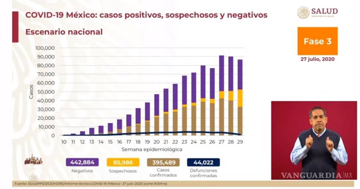 En el último reporte, del 26 de julio, fueron confirmados 390 mil 516 casos positivos y 43 mil 680 defunciones.