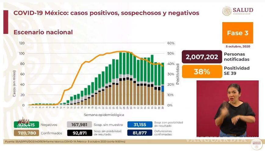 En el último reporte, del 4 de octubre, fueron confirmados 761 mil 665 casos positivos y 79 mil 088 defunciones.