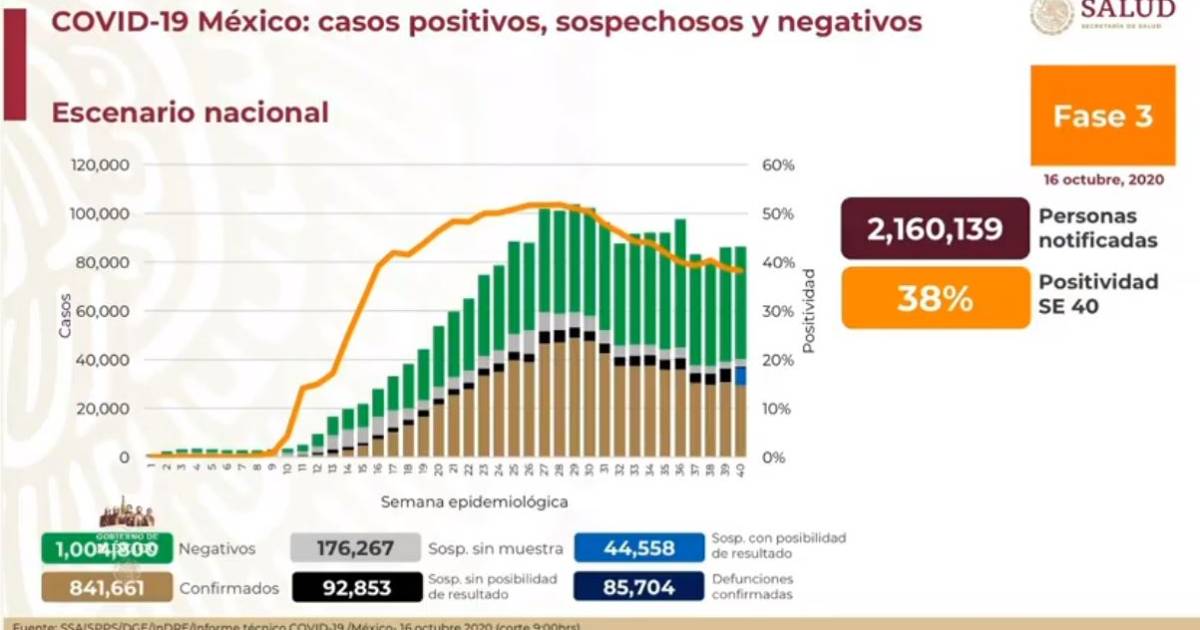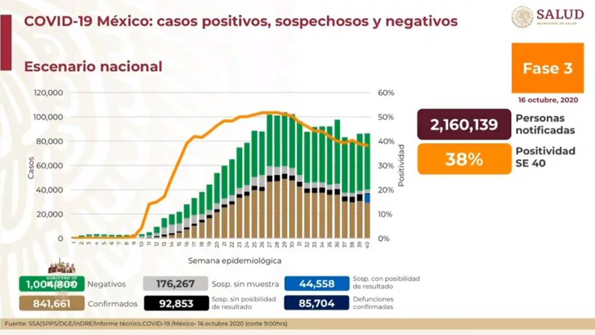En el último reporte, del 15 de octubre, fueron confirmados 834 mil 910 casos positivos y 85 mil 285 defunciones.