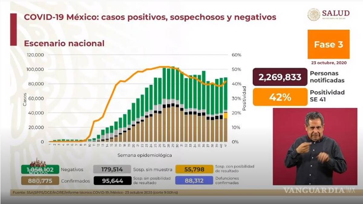 En el último reporte, del 22 de octubre, fueron confirmados 874 mil 171 casos positivos y 87 mil 894 defunciones.