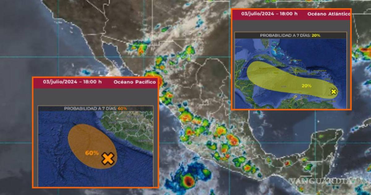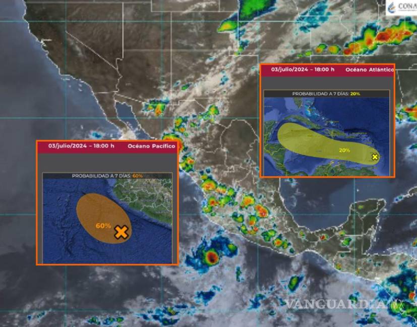 El Servicio Meteorológico Nacional y el Centro Nacional de Huracanes se mantienen en vigilancia por dos zonas de baja presión, con riesgo de desarrollo ciclónico en el Atlántico y en el Pacífico
