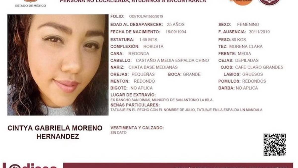 Mientras en la Ciudad de México se informó de la desaparición de Laura Karen Espíndola, quien la noche del martes abordó un taxi al sur de la Ciudad de México muy cerca del Metro General Anaya y no regresó a casa, en Edomex, Cintya Gabriela Moreno Hernández, de 25 años de edad, quien también fuera reportada como desaparecida, apareció dos días después en la cajuela de un vehículo en la Ciudad de México. Estaba golpeada, maniatada y vendada.