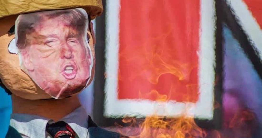 Unos 50 migrantes mexicanos y centroamericanos se reunieron a unos metros del muro fronterizo que divide a Estados Unidos y México, en la zona de Playas de Tijuana, en donde protestaron contra la violencia policial con la quema de dos piñatas con la figuras del Presidente estadounidense, Donald Trump, y de un agente de la policía.