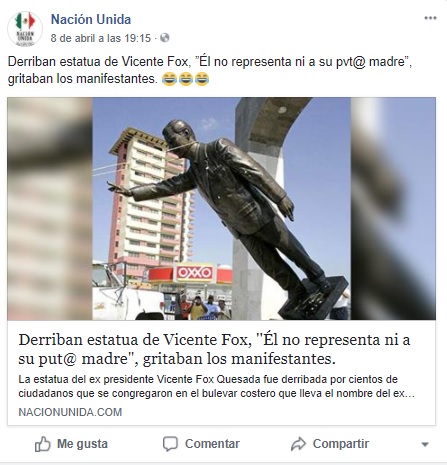 CDMX.- Una nota publicada el 8 de abril pasado en el portal nacionunida.com afirma que la estatua del expresidente Vicente Fox Quesada, ubicada en el bulevar costero de Boca del Río, Veracruz, fue derribada por cientos de ciudadanos en fechas recientes durante el actual proceso electoral. La nota hasta el momento tiene casi 8 mil interacciones en redes.