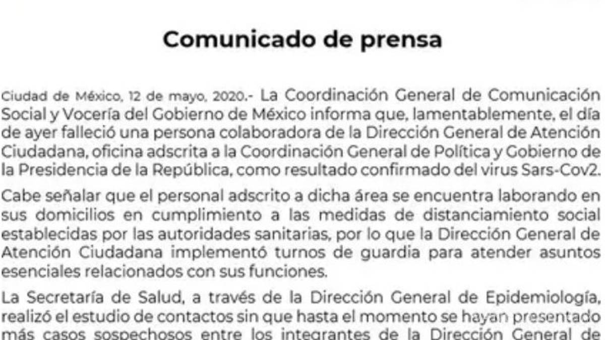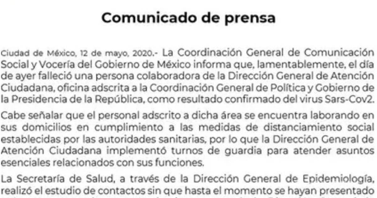 La Coordinación General de Comunicación Social y Vocería del Gobierno de México, informó que uno de sus trabajadores falleció por coronavirus (COVID-19).
