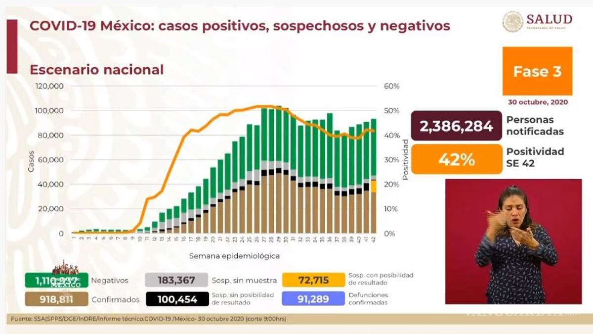 En el último reporte, del 29 de octubre, fueron confirmados 912 mil 811 casos positivos y 90 mil 773 defunciones.