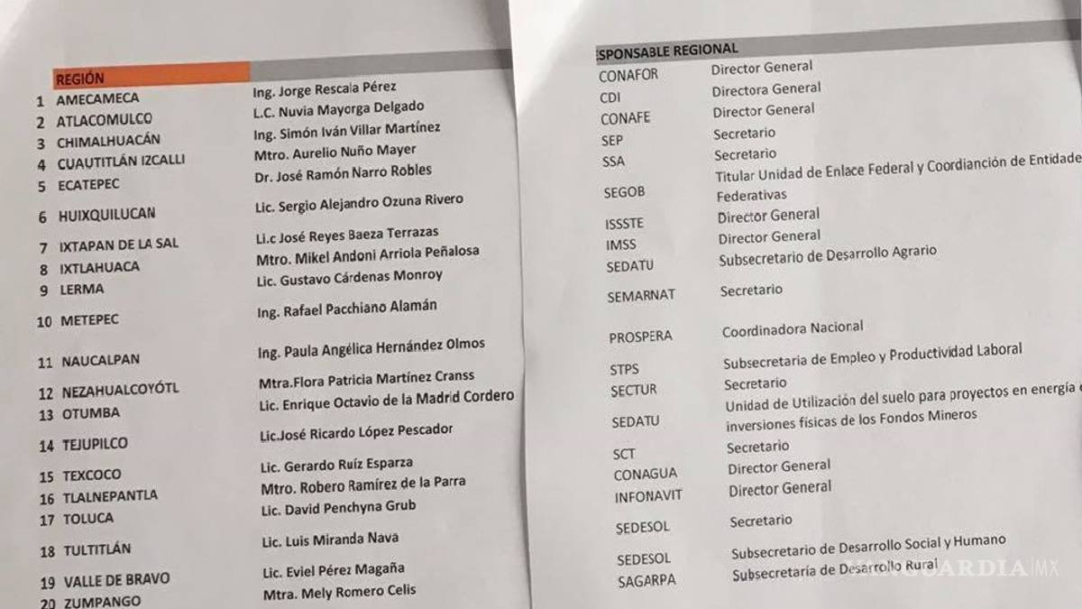 Entre los funcionarios están los secretarios de Educación Pública, Aurelio Nuño Mayer, que tiene asignadas tareas en el municipio de Cuautitlán Izcalli; de Salud, José Narro Robles, en Ecatepec; de Comunicaciones y Transportes, Gerardo Ruiz Esparza, en Texcoco; de Desarrollo Social, Luis Enrique Miranda Nava, en Tultitlán, y de Medio Ambiente y Recursos Naturales, Rafael Pacchiaco.