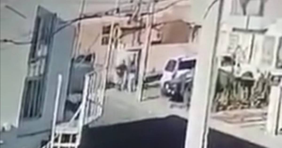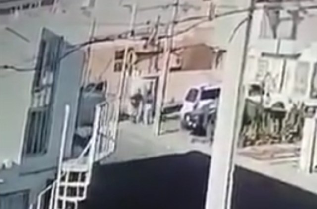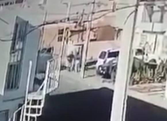 En el video se obevra como uno de los delincuentes se baja del vehículo y se dirige hacia ellos, amaga a la mujer poniéndole la pistola en la cabeza e intenta arrebatarle al niño.