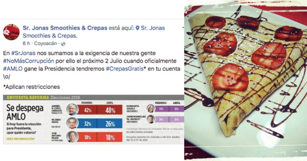 Una cafetería de la Ciudad de México anunció: “nos sumamos a la exigencia de nuestra gente #NoMásCorrupción por ello el próximo 2 Julio cuando oficialmente #AMLO gane la Presidencia tendremos #CrepasGratis”