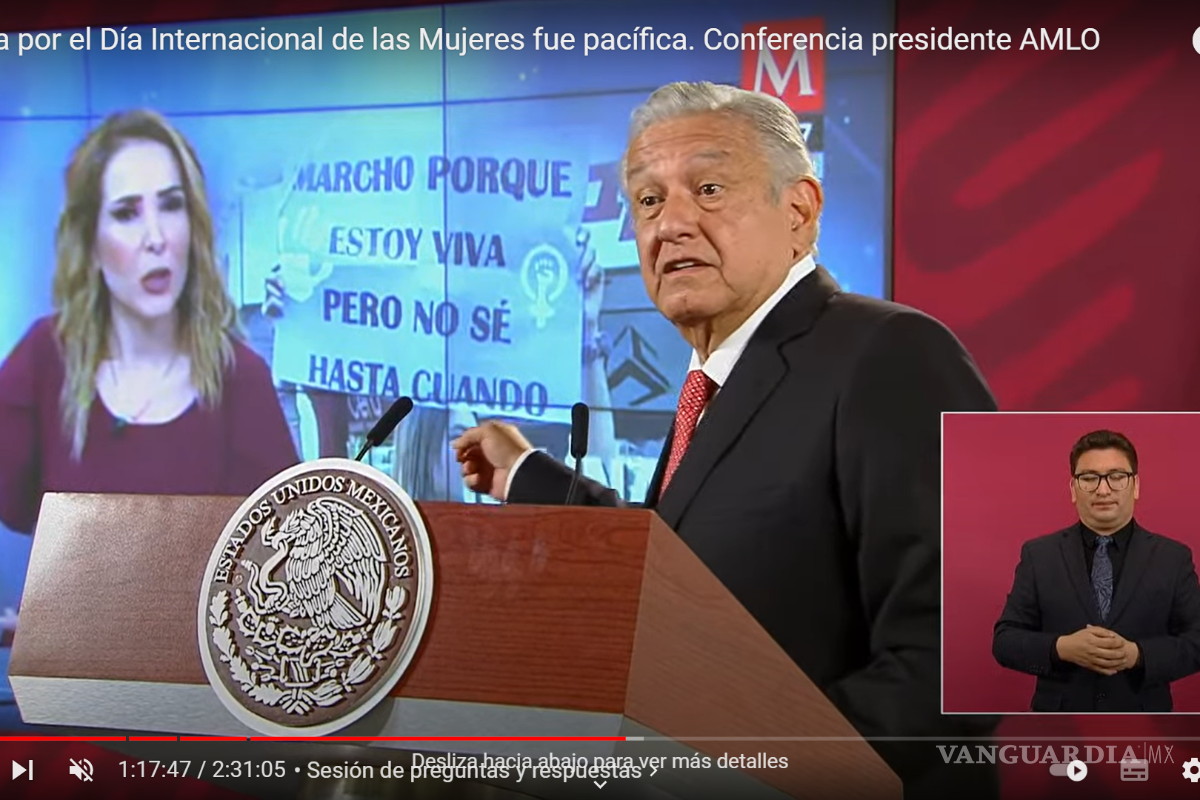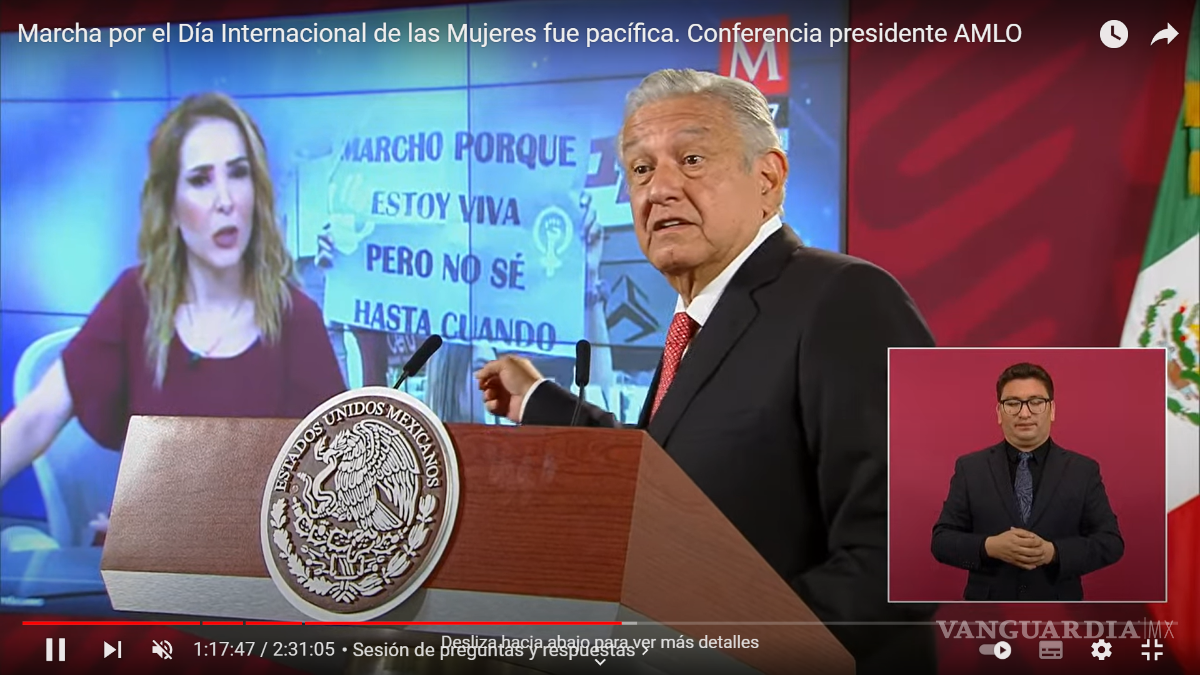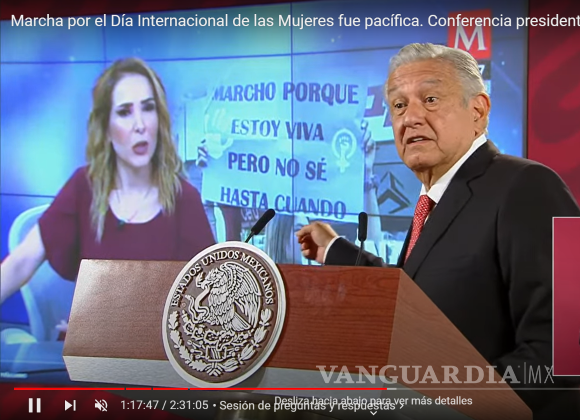 En conferencia de prensa, AMLO exhibió a la conductora Azucena Uresti por transmitir en vivo desde la marcha feminista del Día Internacional de la Mujer, así como criticar una “ciudad amurallada”.