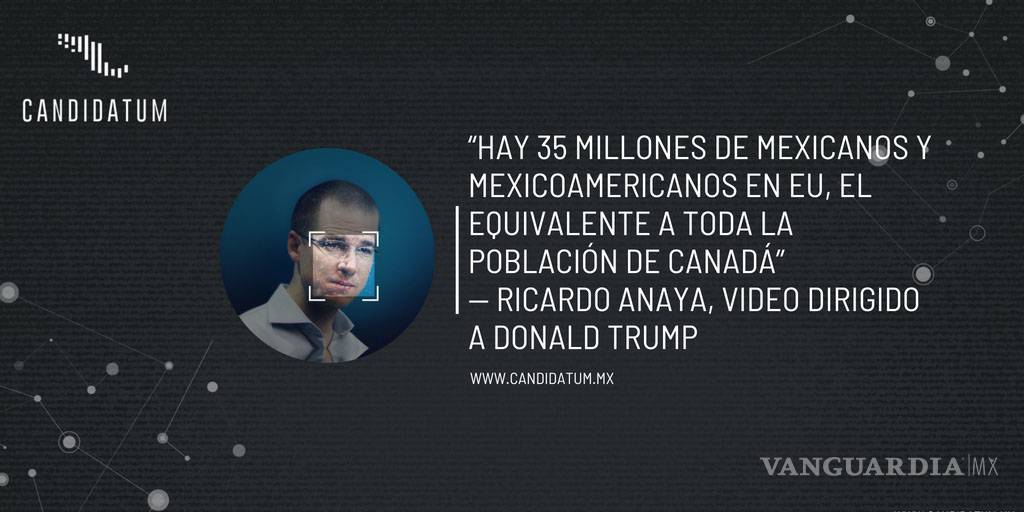 En uno de los spots de Ricardo Anaya, publicados en su canal de YouTube, el candidato de la coalición Por México al Frente se dirigió al presidente de los EU, Donald Trump de manera directa. Refiriéndose a los dreamers, Anaya dijo: “Hay 35 millones de mexicanos y mexicoamericanos en EU, que es el equivalente a toda la población de Canadá”.
