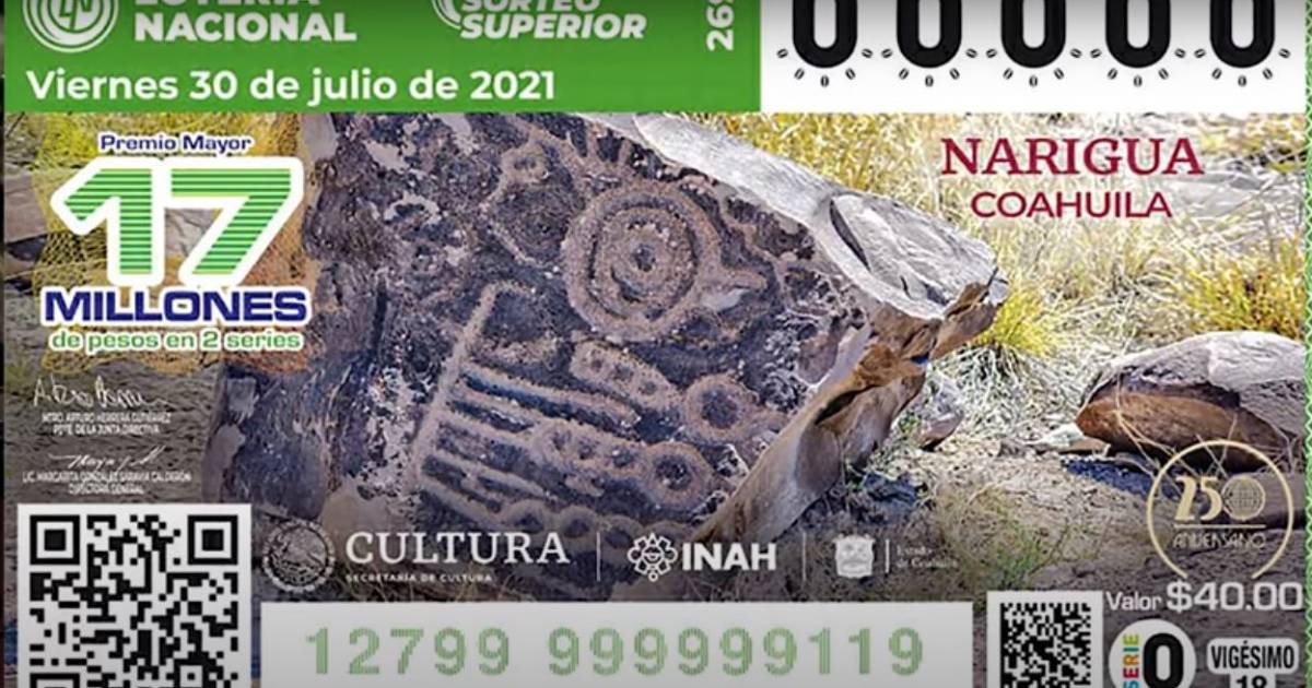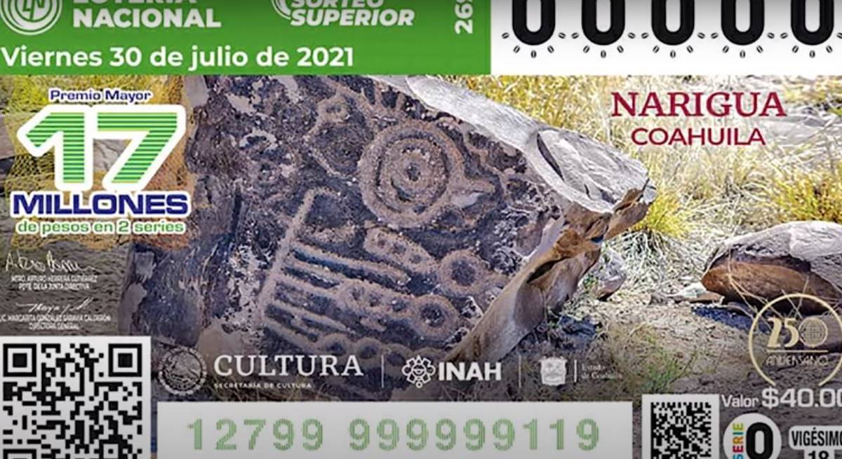 A partir de hoy sábado 24 de julio saldrán a la venta dos millones 400 mil cachitos de la Lotería Nacional que promueven el sitio de petrograbados de Narigua en Coahuila.