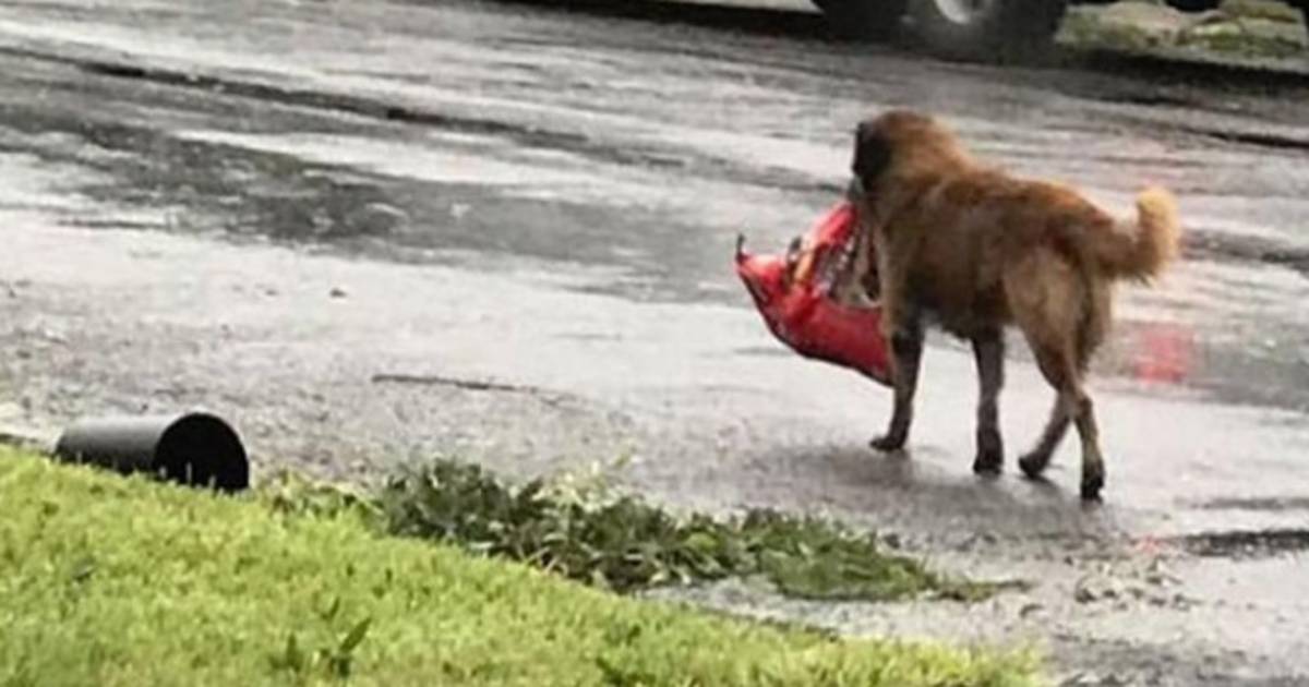 Tyle Dockens subió en su cuenta de Facebook la fotografía de Otis, un perro que sin ser animal callejero, huía de los estragos del fenómeno "Harvey" cargando una colsa de croquetas en el hocico.