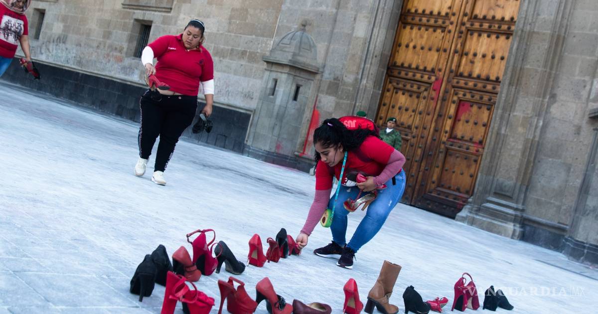 “Estas zapatillas representan a las cientos de compañeras que han muerto en los feminicidios que hay a diario en México. Las calcetitas rojas son en representación de las niñas y bebés que murieron asesinadas”, comenta una mujer quien imite dar su nombre por temor a represalias.