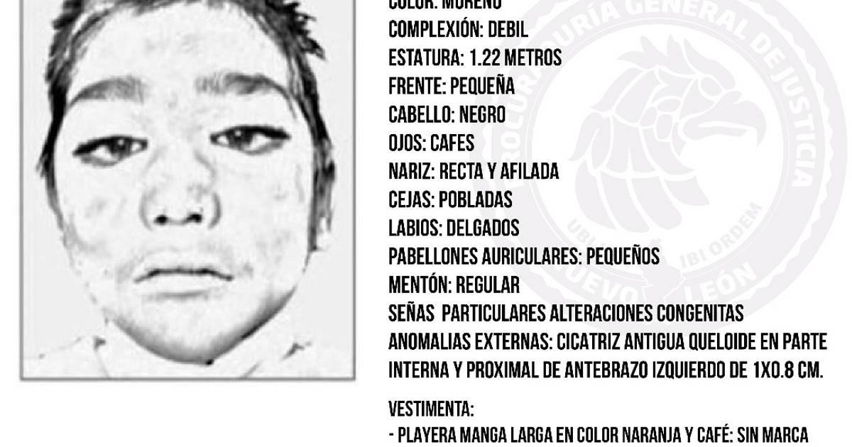 En la imagen se reveló la media filiación del pequeño: el infante tenía entre 8 y 10 años; color moreno, complexión débil, estatura 1.22 metros, frente pequeña, cabello negro, ojos cafés, nariz recta y afilada, cejas pobladas, labios delgados, pabellones auriculares pequeños, mentón regular.