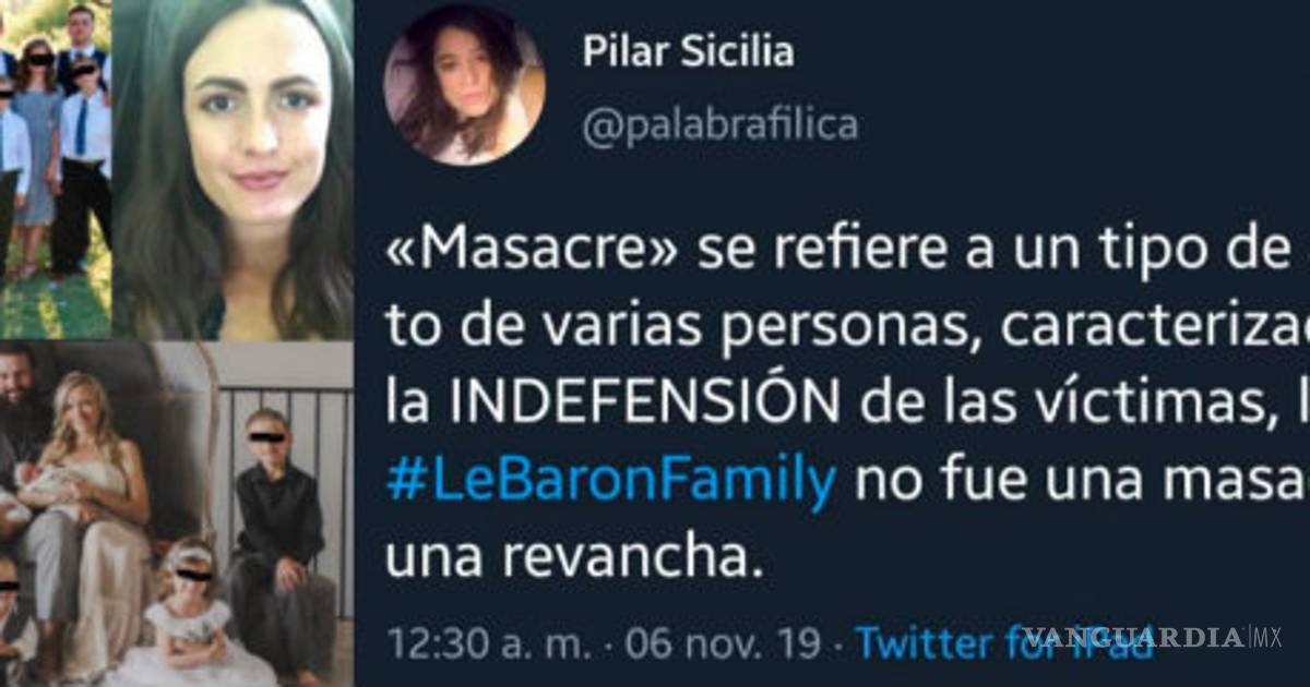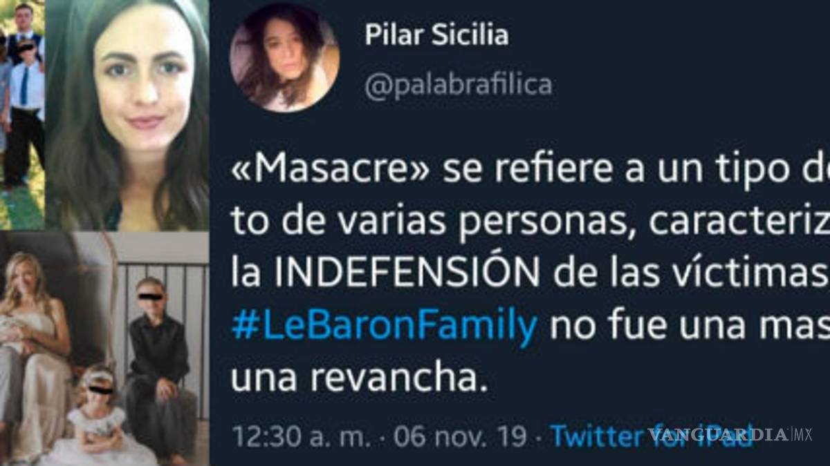 La directora general de la revista Algarabía, María del Pilar Montes de Oca Sicilia comentó “Lo de los #LeBarónFamily no fue una masacre, fue una revancha” a través de su cuenta de Twitter.