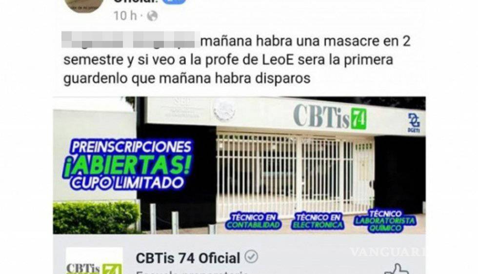 La amenaza fue publicada en la página de Facebook del CBTIS 74