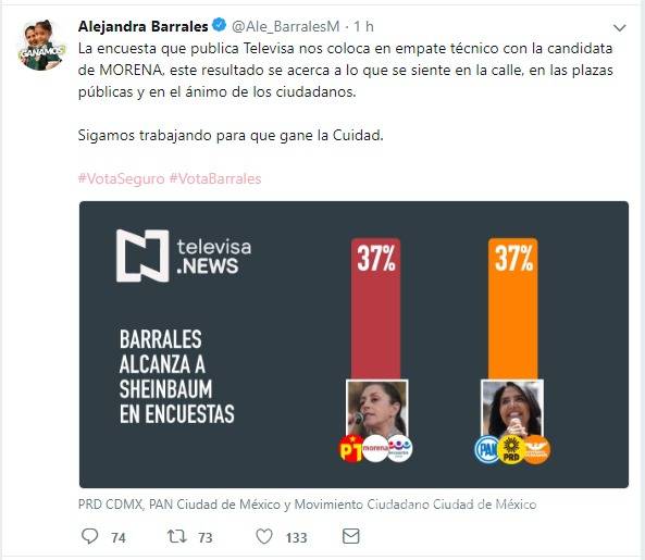 La misma Barrales, en el tercer debate chilango, exhibió un cartel que  mostraba una encuesta con el logotipo de Publimetro. La encuesta ubicaba a Barrales en segundo lugar con 37% de las preferencias electorales, solo 0.7% abajo de Sheinbaum, candidata de “Juntos Haremos Historia”.