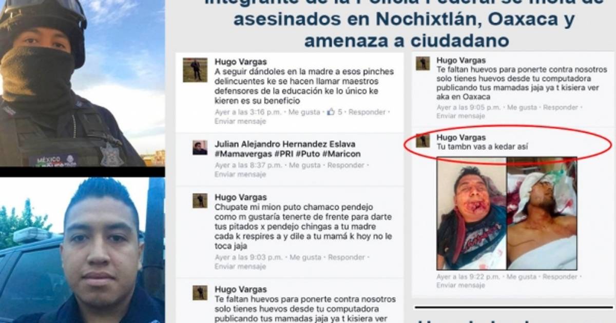El presunto agente federal, identificado en Facebook como Hugo Vargas, quien amenaza de muerte a otros usuarios de Facebook, quienes se manifestaban en contra de la violencia que se vivo en el estado de Oaxaca.