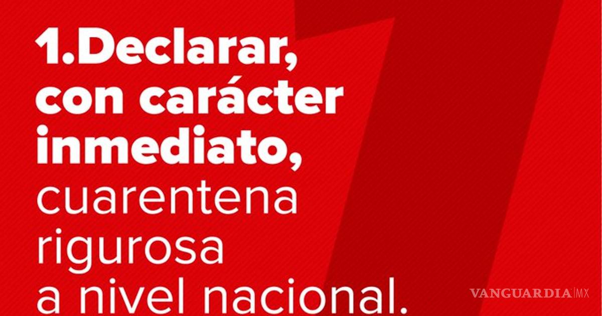 Entre las acciones, que supuestamente fueron “evaluadas por un grupo de expertos”, se propone declarar inmediatamente una cuarentena rigurosa a nivel nacional, eliminar el IVA durante abril y mayo, mientras que el gobierno federal deberá pagar un complemento de salario a los trabajadores que han sido afectados por los recortes ante la emergencia.