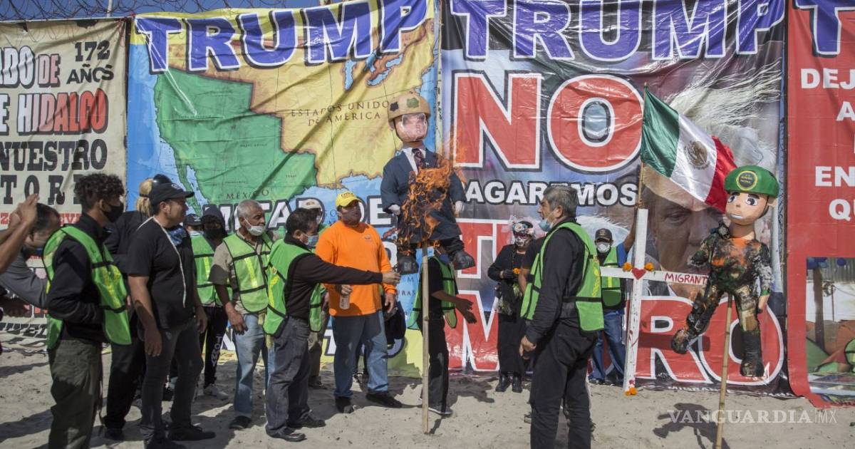 TIJUANA, BC.- Unos 50 migrantes mexicanos y centroamericanos se reunieron a unos metros del muro fronterizo que divide a Estados Unidos y México, en la zona de Playas de Tijuana, en donde protestaron contra la violencia policial con la quema de dos piñatas con la figuras del presidente estadounidense, Donald Trump, y de un agente de la policía.