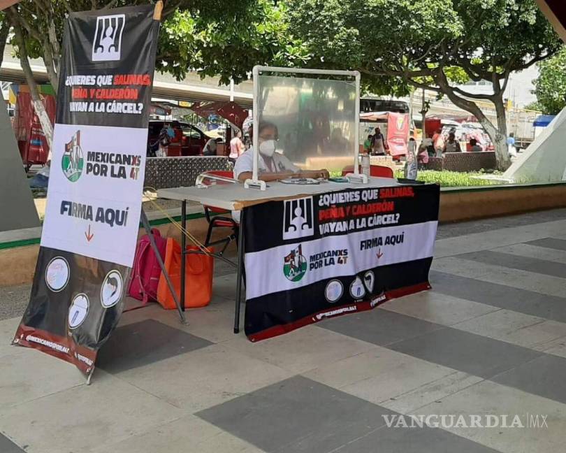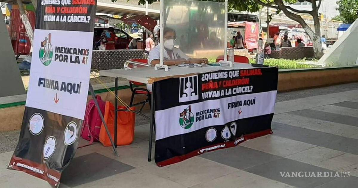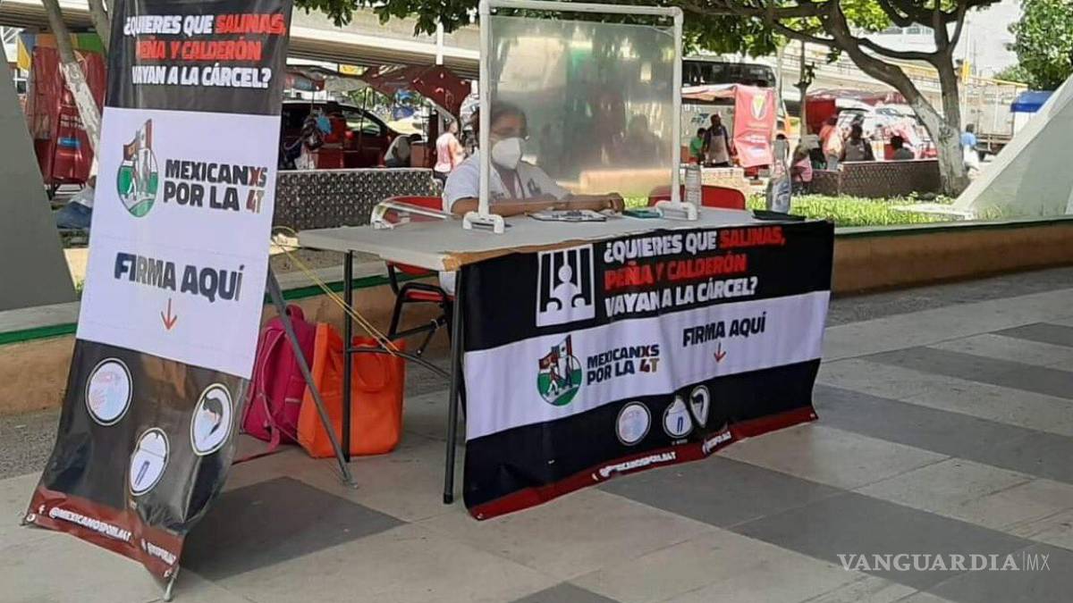 En la imagen se puede leer un pendón en donde se pregunta: “¿Quieres que Salinas, Peña y Calderón vayan a la cárcel? Mexicanxs por la 4T vota aquí”.