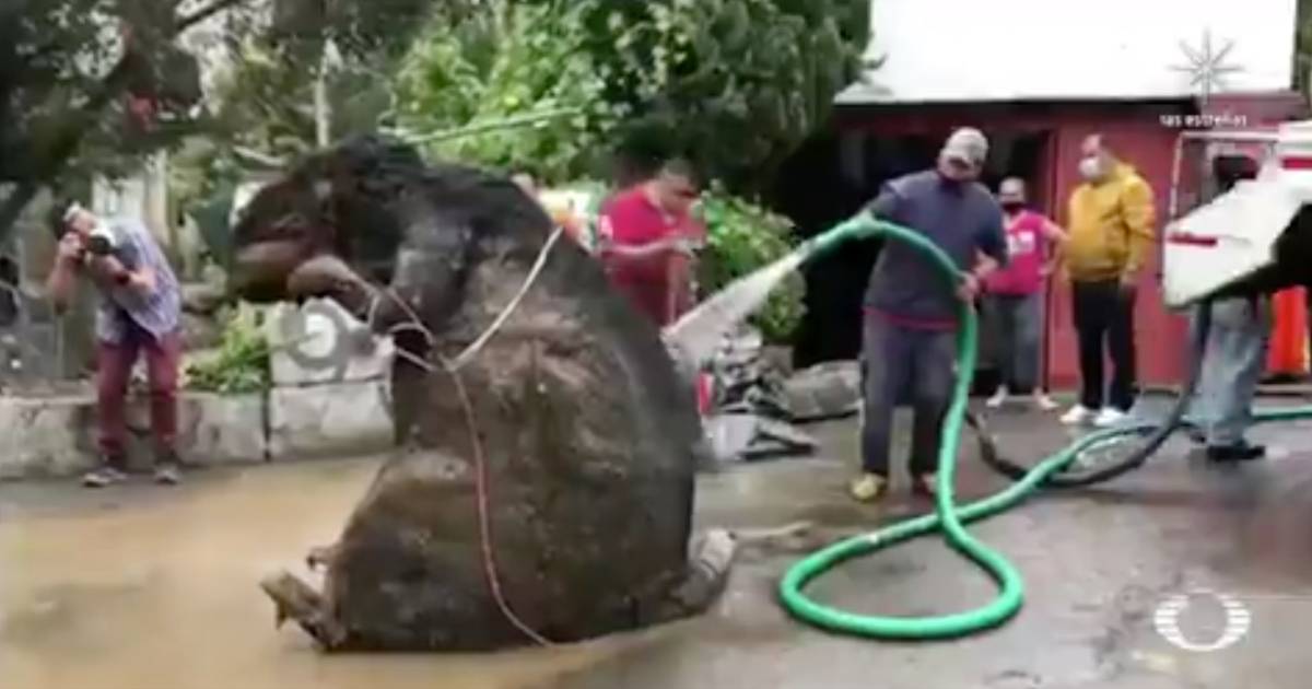 El peluche fue arrastrado y enjuagado por equipos de seguridad, de acuerdo a imágenes compartidas por el programa En Punto, de Televisa, la botarga superaría el medio y medio de altura.