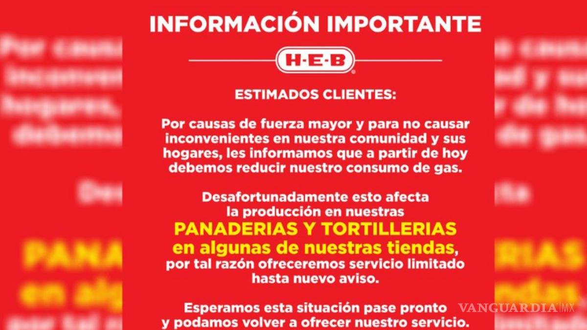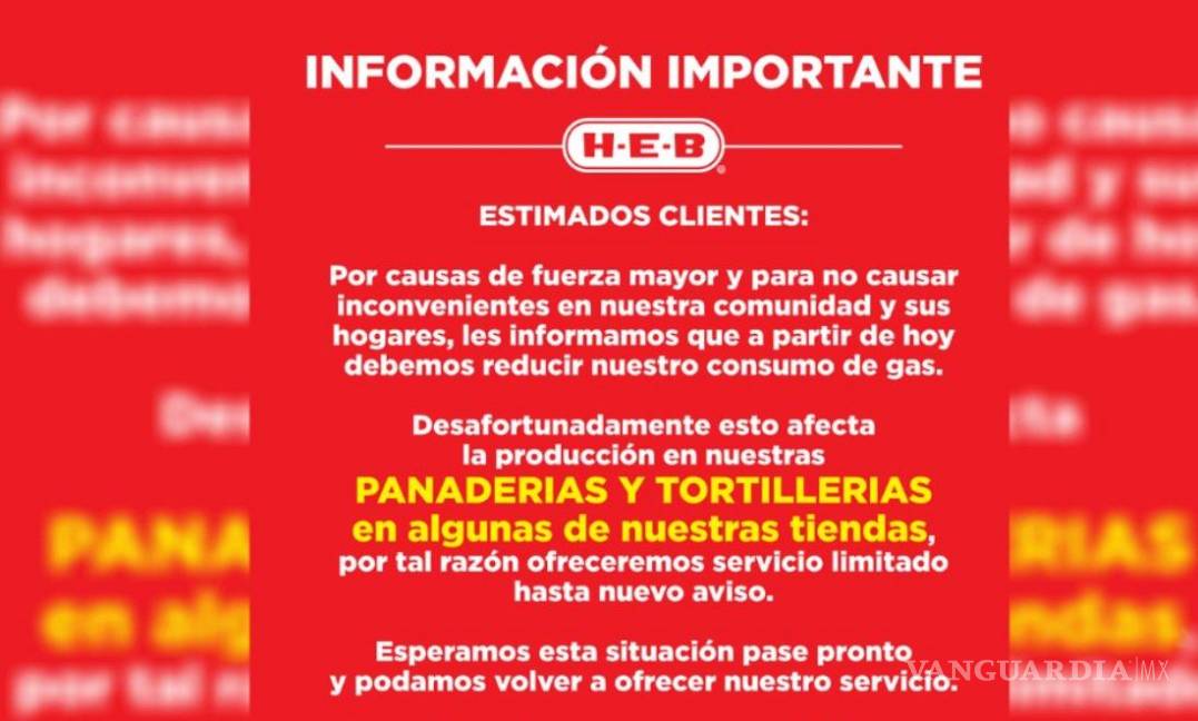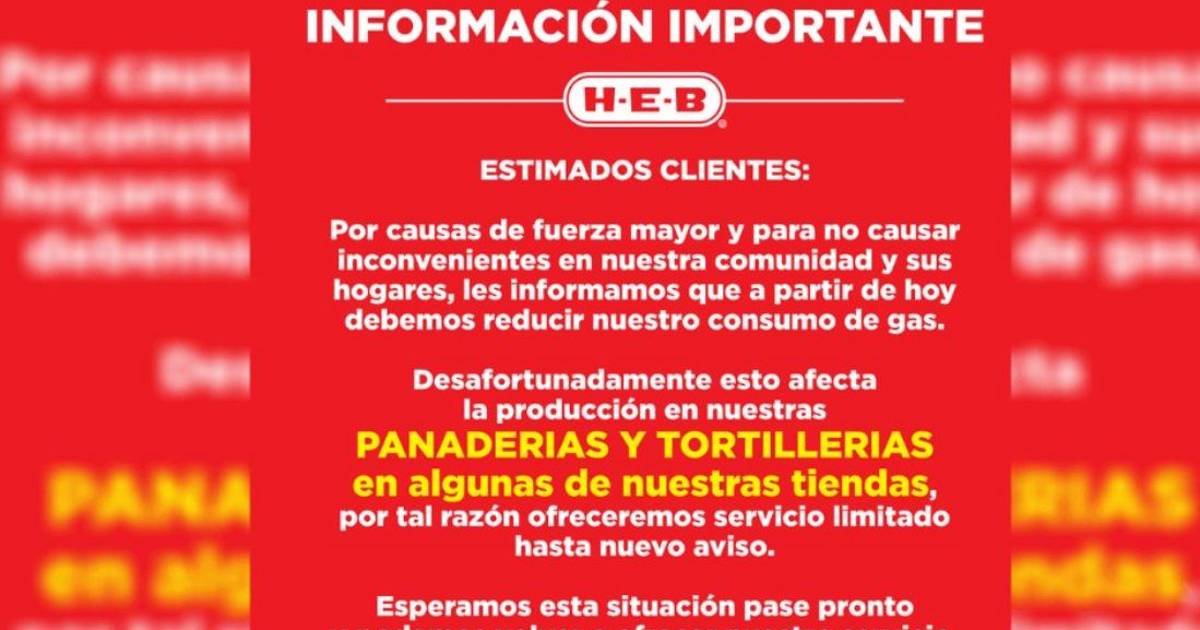 La cadena de supermercados H-E-B informó este miércoles que debido a la problemática que ha vivido México recientemente con el suministro de gas que ha provocado desabasto eléctrico, la producción de pan y tortillas en sus tiendas se ofrecerá de manera limitada hasta nuevo aviso.