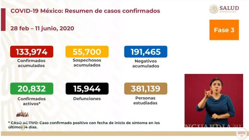 En el último reporte, del 10 de junio, fueron confirmados 129 mil 184 casos positivos, 19 mil 897 activos y 15 mil 357 defunciones.