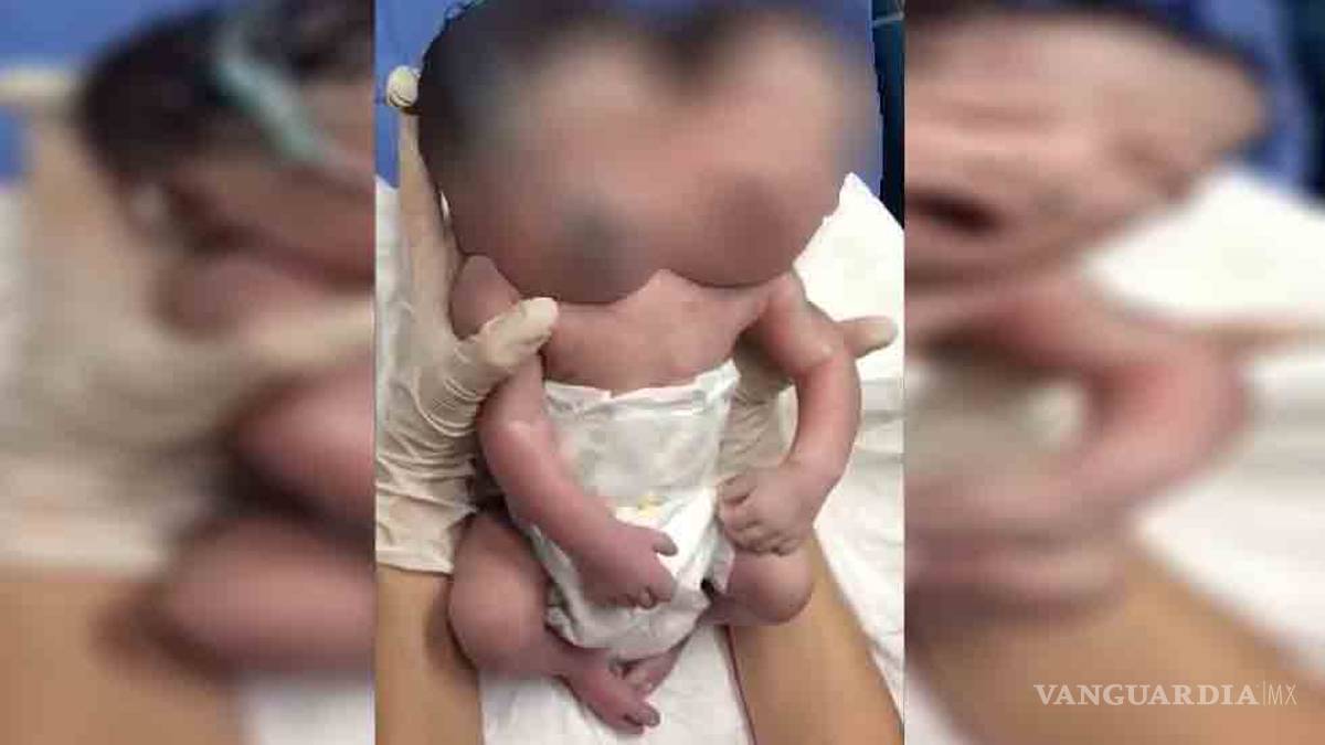 En el material muestran a un bebé recién nacido -posiblemente del sexo masculino-, con dos cabezas, ambas tienen mangueras en sus narices, al parecer de oxígeno.