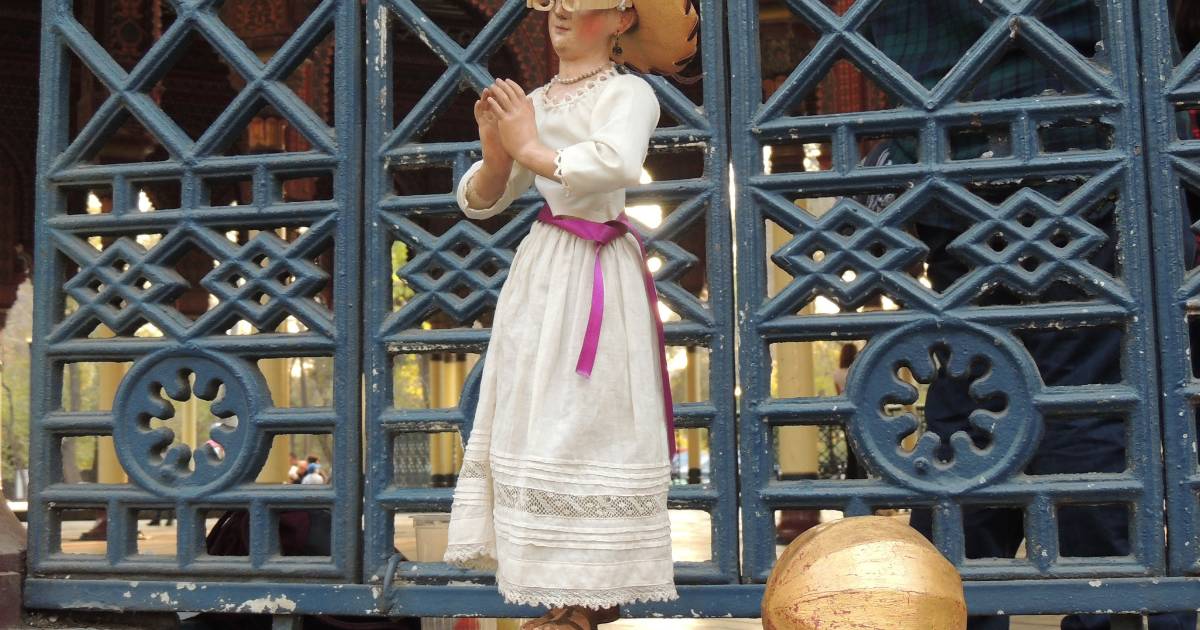 A la figura, que viste de blanco y tiene las manos en posición de oración, le pusieron unas gafas bohemias que simbolizan la llegada de los nuevos vecinos, un sombrero para protegerse del sol mientras frena desahucios y una perrita llamada Banqueta (acera) para recuperar el espacio público, contó Valenzuela.
